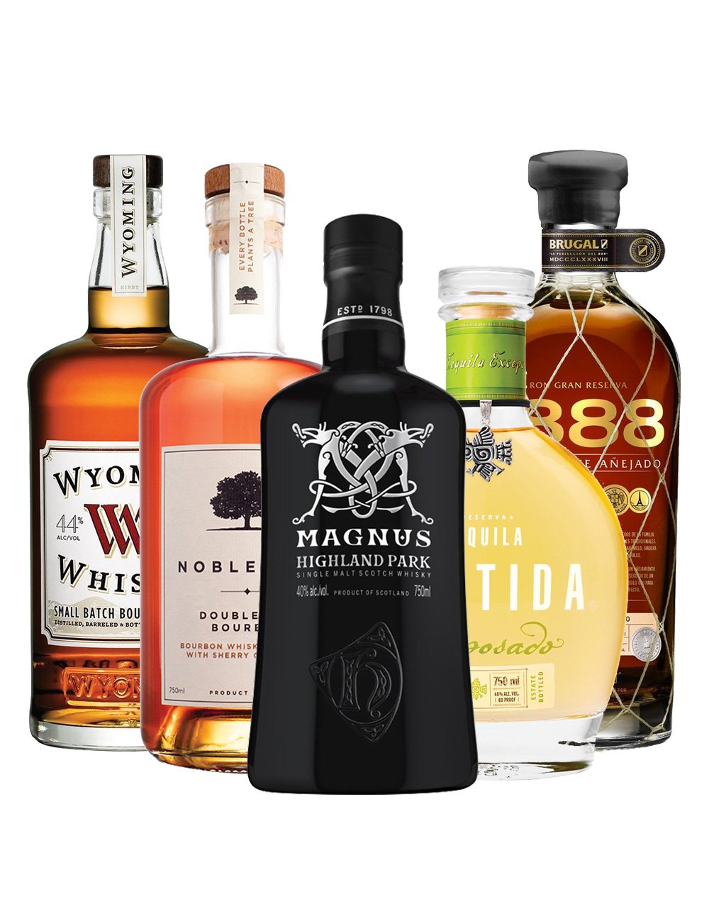 Includes (5 Bottles): Wyoming Whiskey Small Batch Bourbon Whiskey (750ml), Noble Oak Double Oak Bourbon (750ml), Highland Park Magnus (750ml), Tequila Partida Reposado (750ml), and Brugal 1888 (750ml).