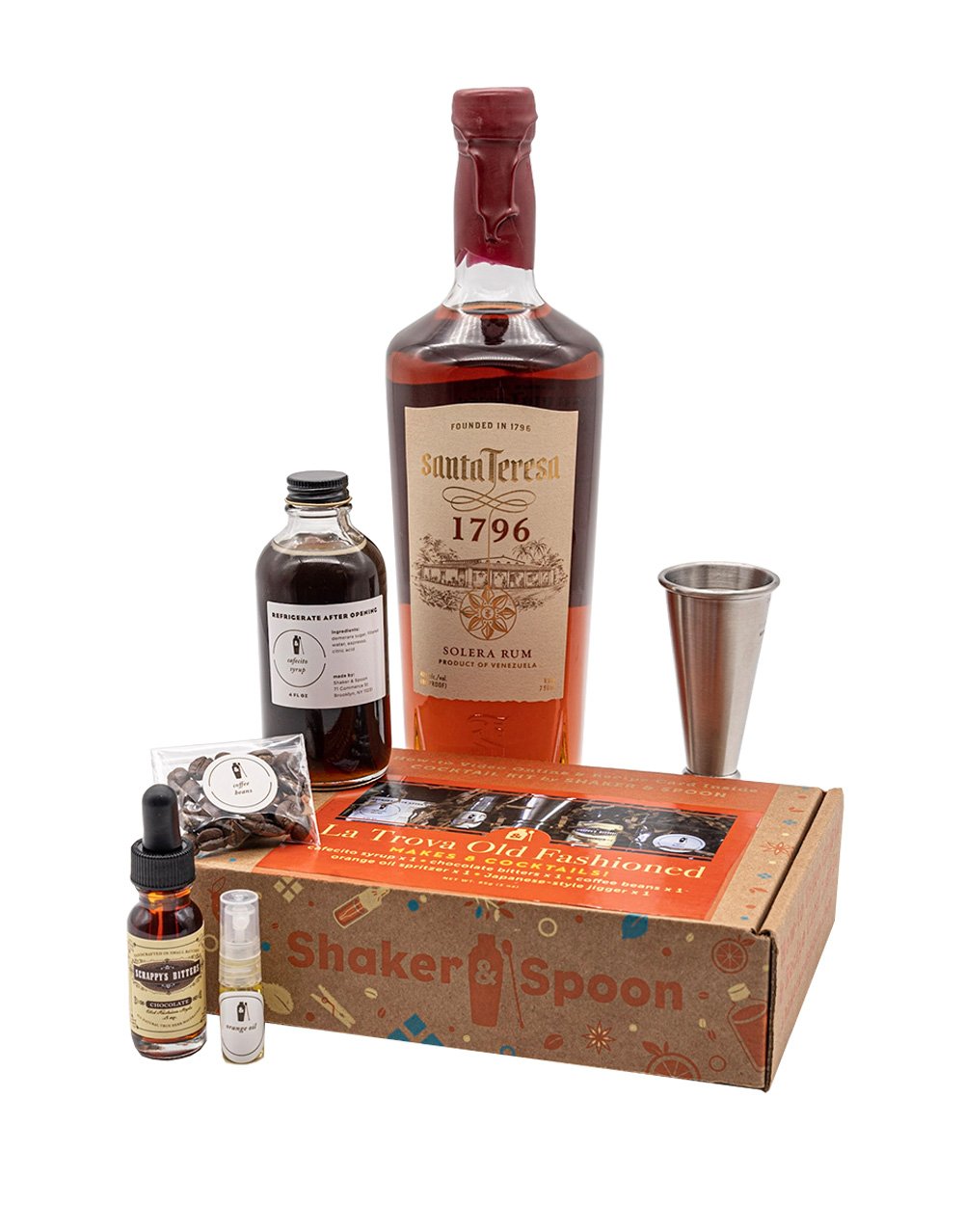 Includes: one (750mL) bottle of Santa Teresa 1796 Rum and a Shaker & Spoon La Trova Old Fashioned kit (cafecito syrup, chocolate bitters, orange oil, coffee beans, jigger, and cocktail recipe card) -- makes 8 cocktails