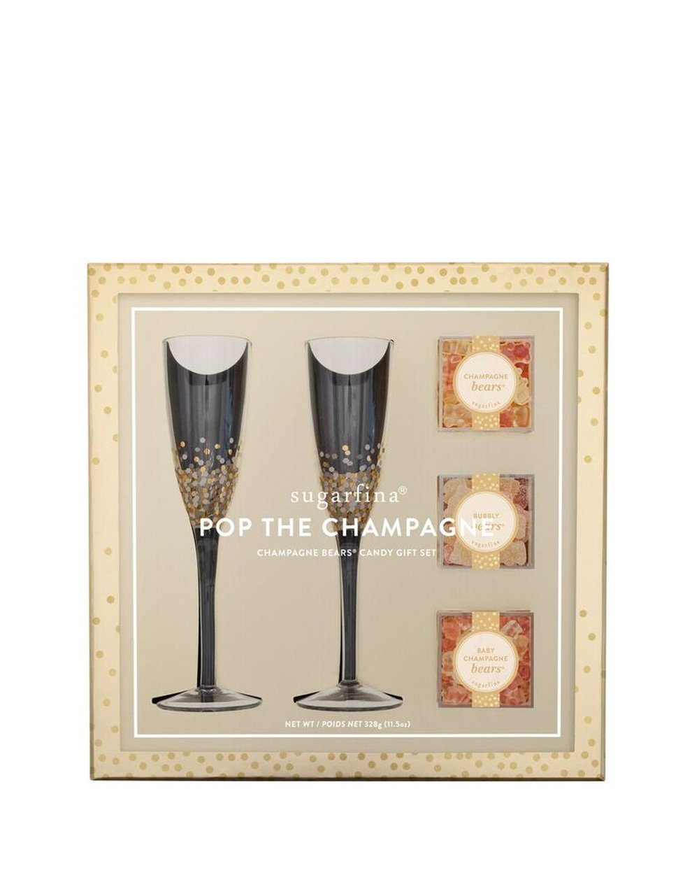 Pop the champagne, it's time to celebrate! This unique gift set includes two sparkling Champagne flutes and three of Sugarfina's best-selling Champagne-infused candies packaged in a beautiful gold foil box.